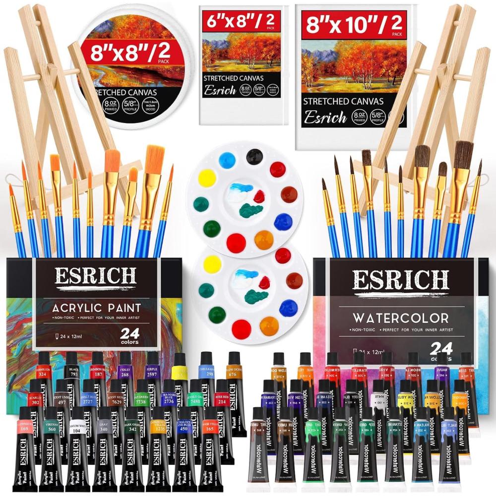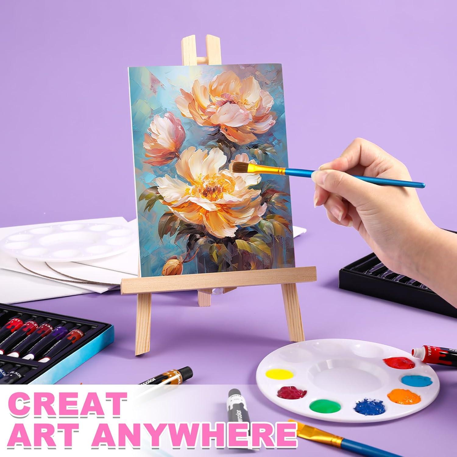 【78PCS Painting Supplies Kits】: The rich artist canvas painting kit includes 24 colors acrylic paint, 24 colors watercolor paint. 2 Adjustable wooden easel, 10 Pcs acrylic brushes(nylon), 10 Pcs watercolor brushes(horsehair), 2 Pcs 8×10” canvas panel, 2 Pcs 6×8”round canvas panel, 2 Pcs 8×8”round canvas panel, 2 art palette.